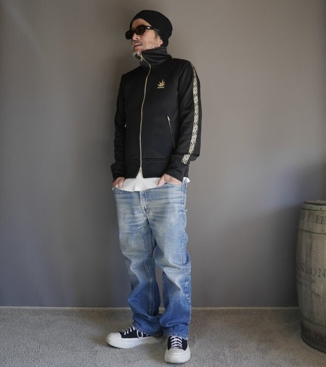 drestrip / HSJ-05 トラックジャケット ブランドの顔ともいえるトラックジャケット。 シンプルだけど一目で存在感がある一枚です。 サイドにはゴールドのデザインライン、胸元のロゴもアクセントになっていて、ブラックのボディにしっかり映える。スポーティな雰囲気を持ちながらも、カジュアルに着こなすだけでなく、街着としてワンランク上のスタイルに仕上がります。 素材はオリジナルで作り込まれたポリエステル生地。劣化が少なく長く愛用できるのも嬉しいポイント。まさに「カジュアルアップの究極」を体現したアイテムです。 Color BLK Material ポリエステル100% Size <2>肩幅42.5cm,身幅49.5cm,着丈64cm,袖丈64cm