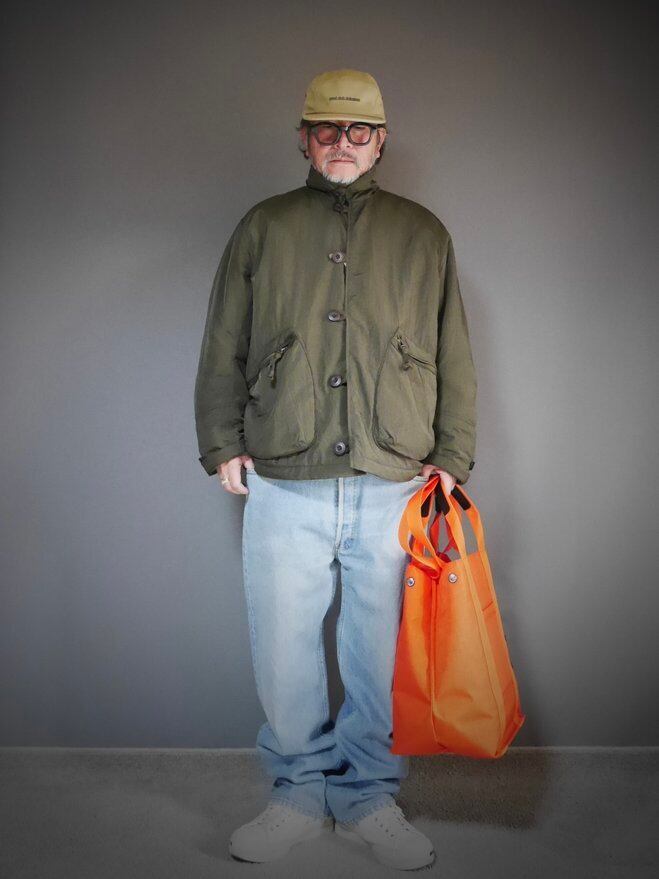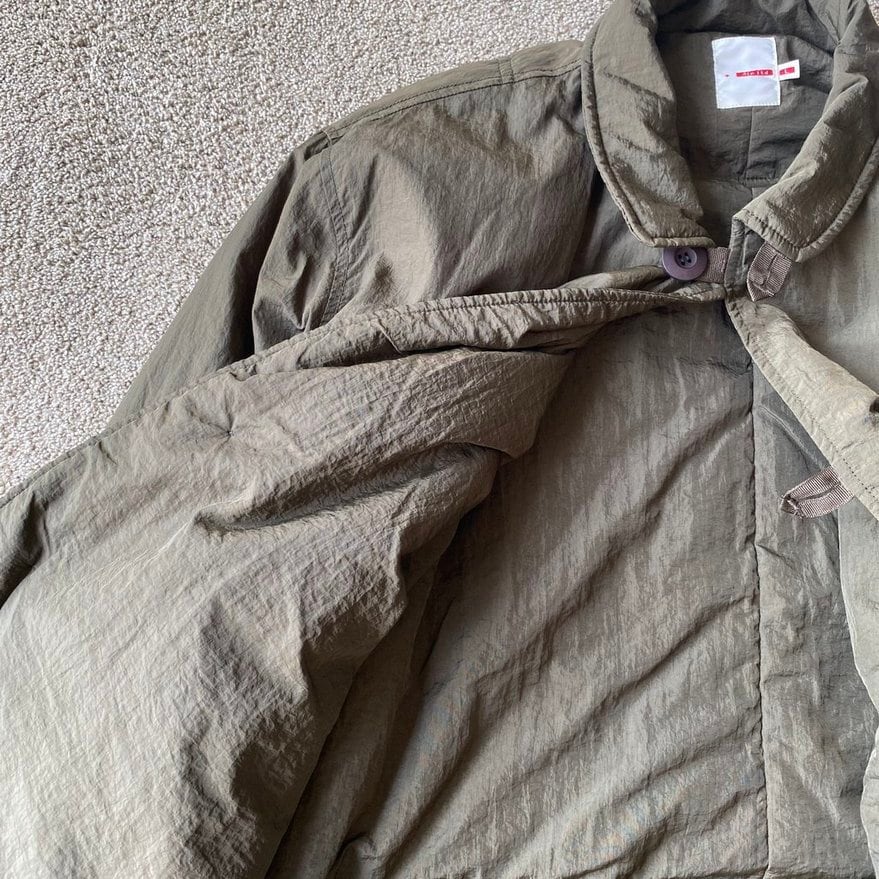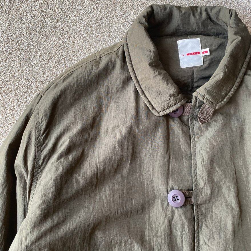 ナイロン素材を使用した中綿入りアウターです。通常ボタンのフロントループはコットンの紐を使いますが、あえてポリテープを使用し、ポイントになる様にデザインをしました。ポケットはフラットな見え方にならない様に、ダーツを入れて立体感を出しています。中綿はあまり厚くならない様に60gのシンサレートを使用しています。もたつきが少なく、重ね着がしやすい程よい厚さです。もちろん保温力も◎