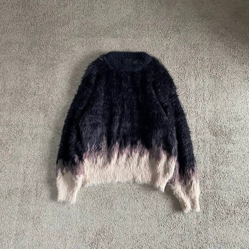 毛足の長いシャギー糸を使用した、オーバーサイズのジャカードニット。