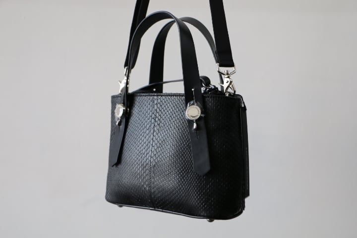 蛇革のプチトートバッグ カツユキコダマ オリジナルシルバー釦 BLK PYTHON