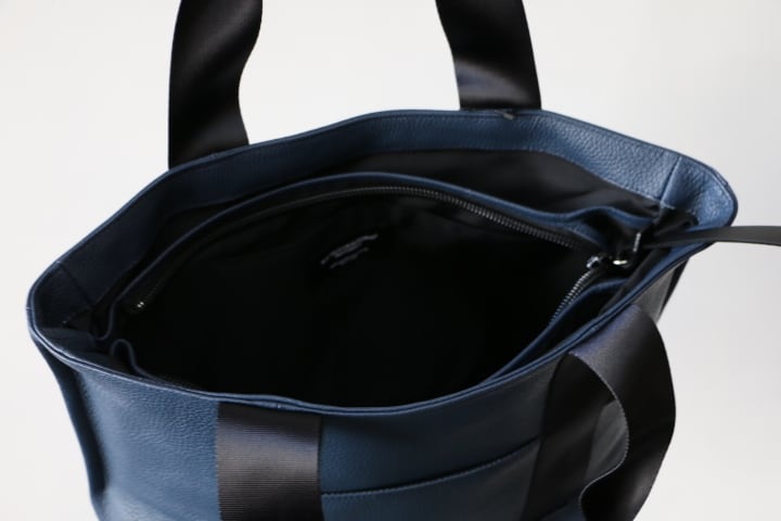 レザー素材にハンドルは高密度ナイロンテープにする事で程よいスポーツ感をプラス。レザーバッグながら、軽やに見えるデザインです。