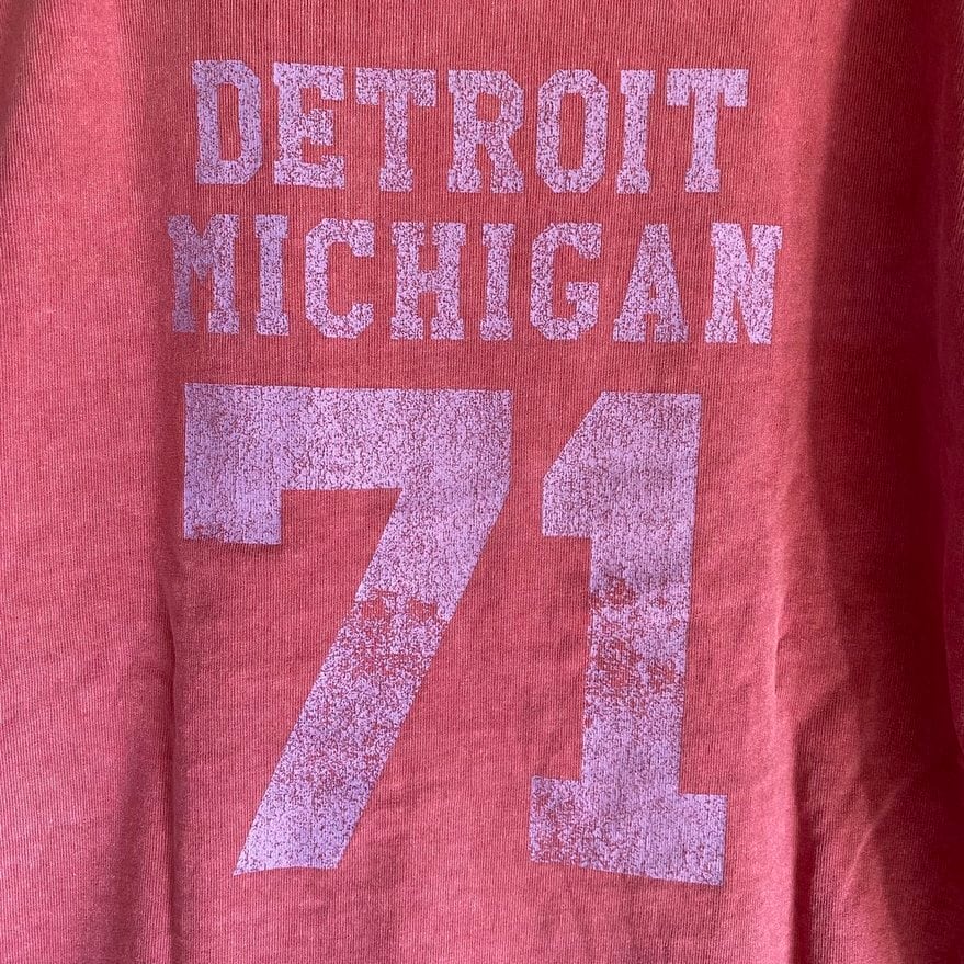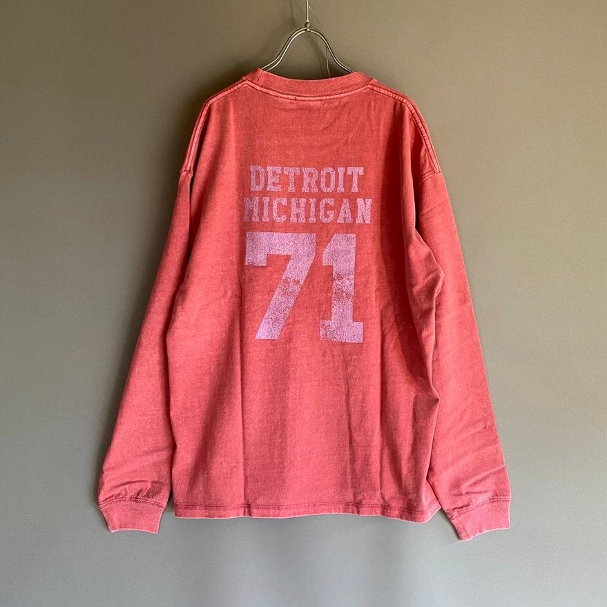 製品ピグメント染めによる自然なムラやプリントのカスレ加工がまるで古着のような今らしいアイテムです。