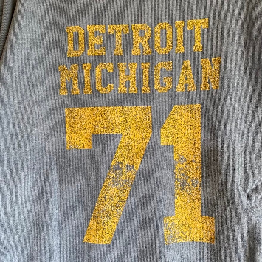 製品ピグメント染めによる自然なムラやプリントのカスレ加工がまるで古着のような今らしいアイテムです。