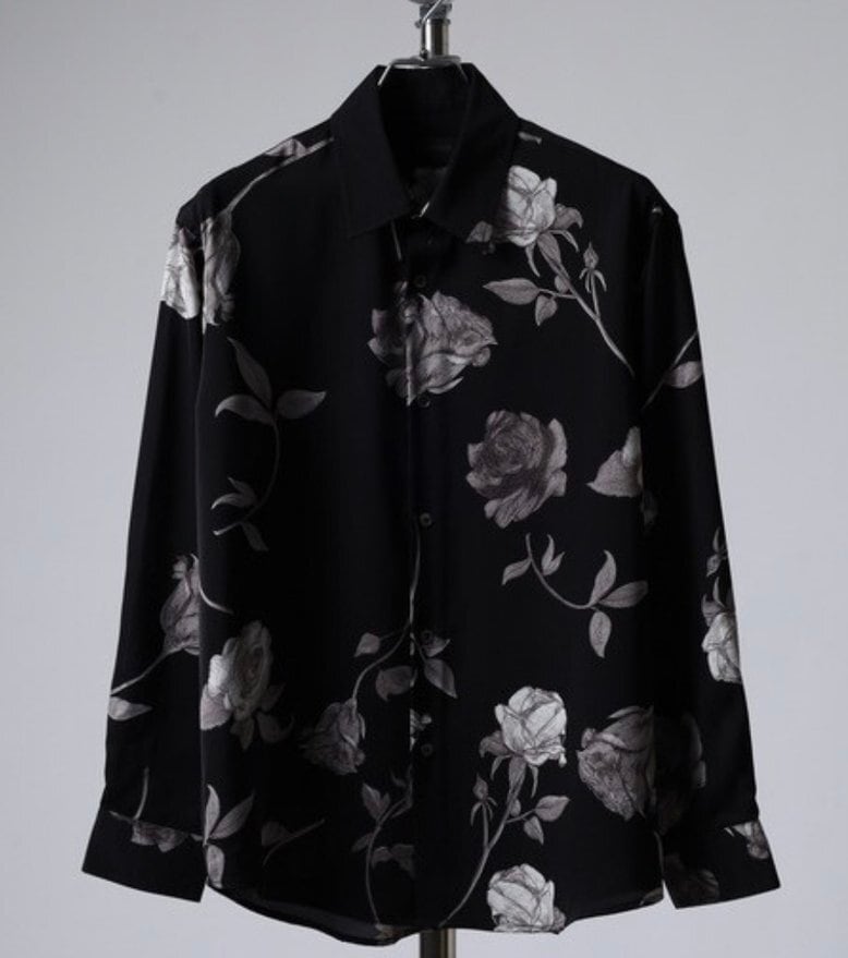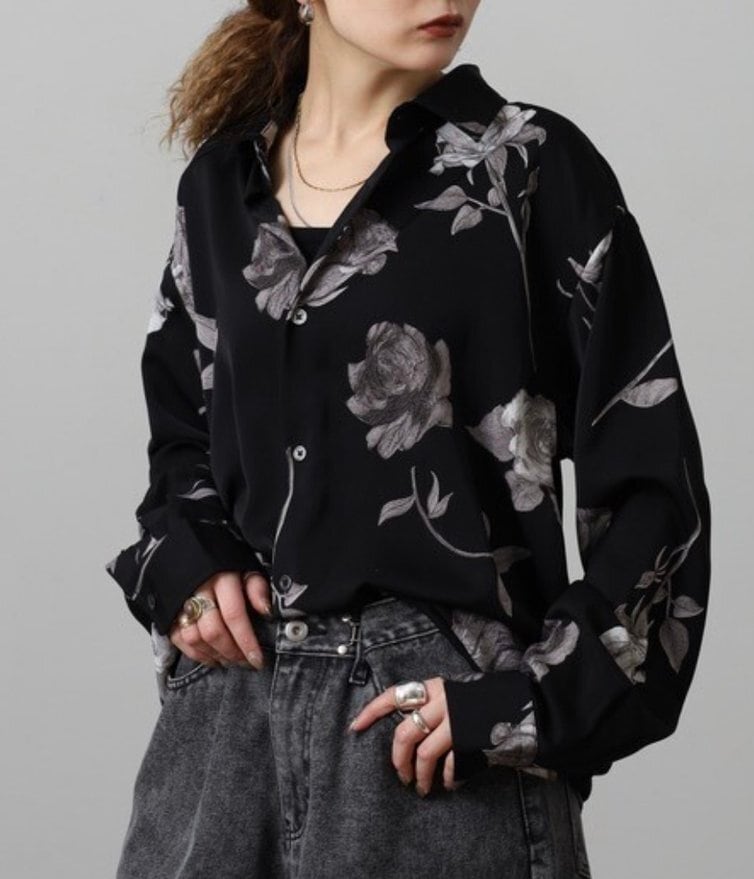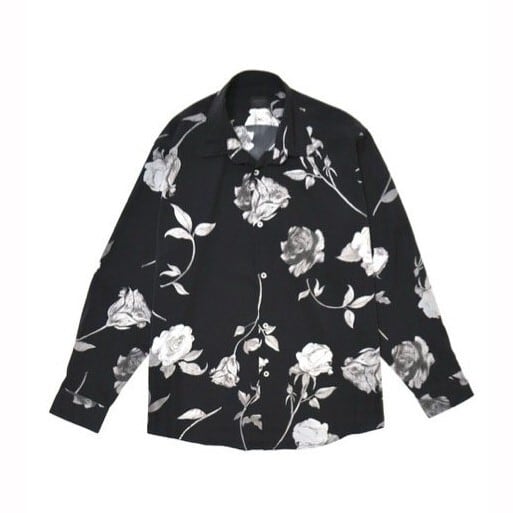 モノトーンで描かれたローズ柄が印象的な総柄シャツ。