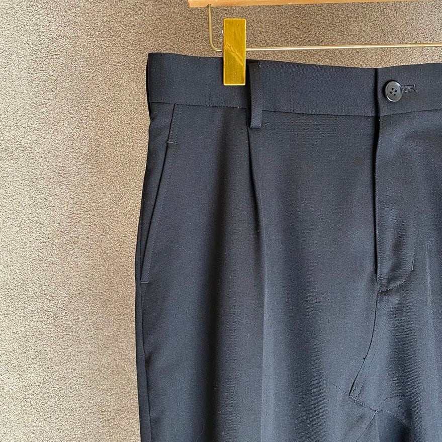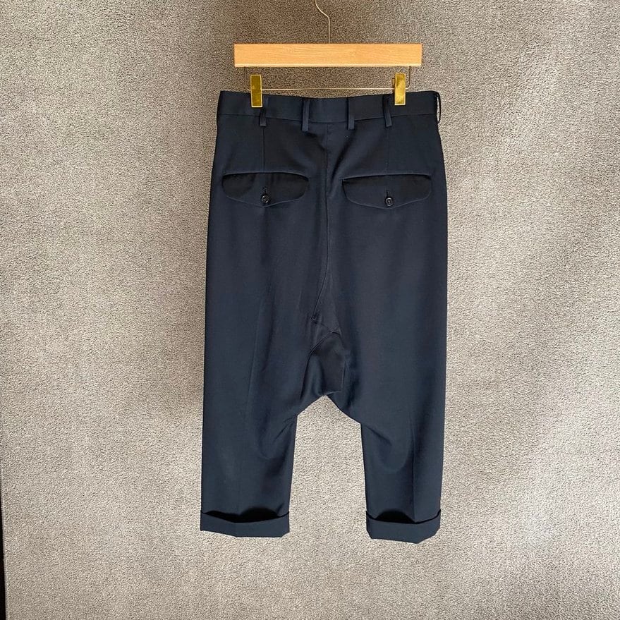 贅沢にウールギャバジンを使用した、フロントにタックが施されたサルエルパンツです。ユニークなシルエットと高いデザイン性が特徴で、カジュアルなスタイルからオフィスカジュアルまで幅広く活躍します!後ろポケットはフラップ付きのボタンポケットとなっており、機能性も兼ね備えています。コンディションも良好で、使用感が少なく綺麗な状態です。